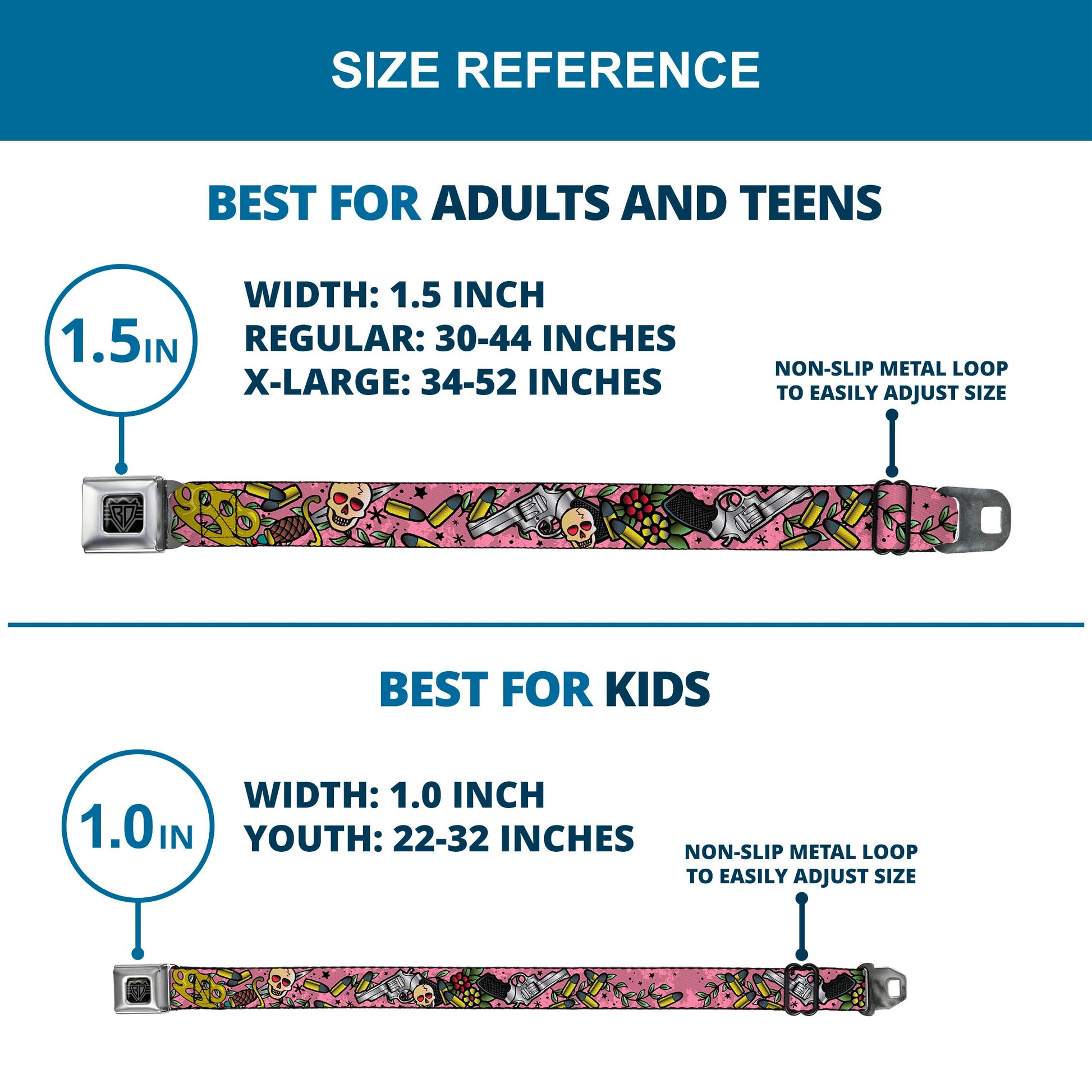 - Our adult-size Seatbelt Belts are 1.5 inches wide and our kid-sized Seatbelt Belts are 1.0 inch wide.
