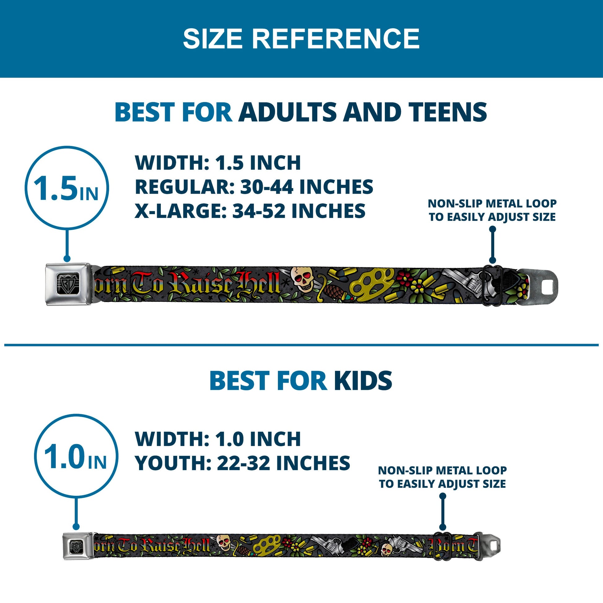 - Our adult-size Seatbelt Belts are 1.5 inches wide and our kid-sized Seatbelt Belts are 1.0 inch wide.