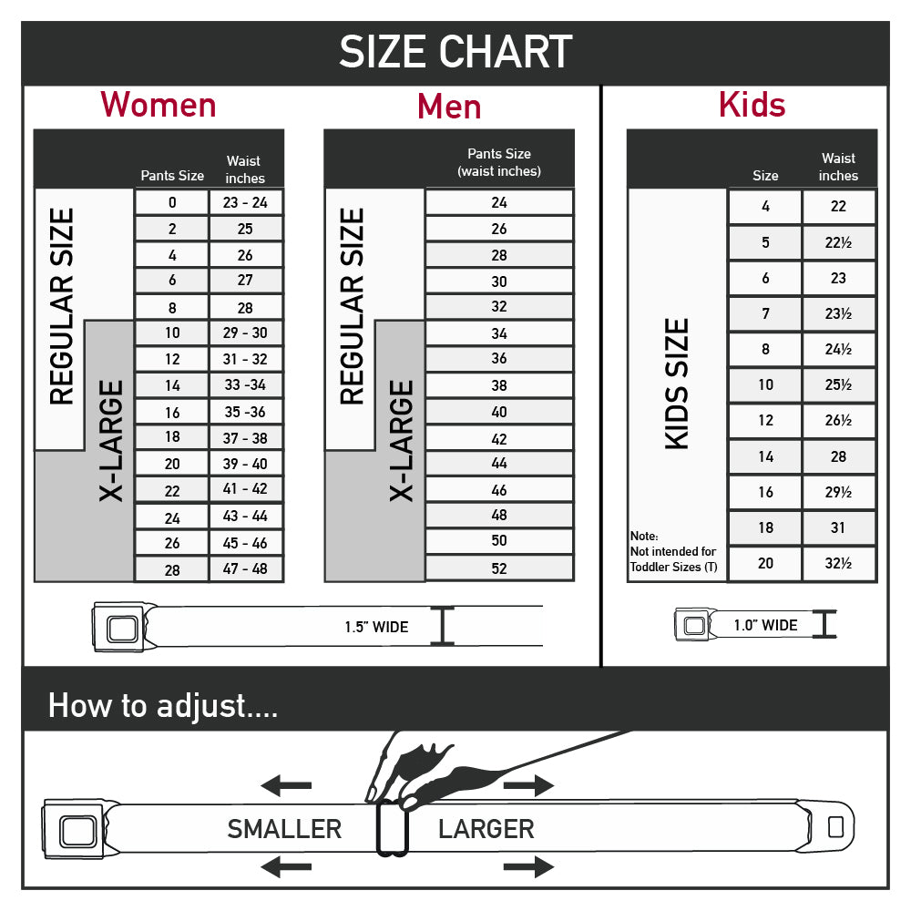 Buckle-Down's iconic Seatbelt Belt is a cool, smart, and exciting blend of fashion and function. Always a conversation starter, our Seatbelt Belt adjusts to perfectly fit your waist while showcasing your unique sense of style. Our Seatbelt Belts are made with authentic automotive style seatbelt buckles making them easy to open and close at the push of a button. Our adult-size Seatbelt Belts are 1.5 inches wide and our kid-sized Seatbelt belts are 1.0 inch wide. This product is Handcrafted in USA by Buckle-Down Inc. and officially licensed by Buckle-Down.