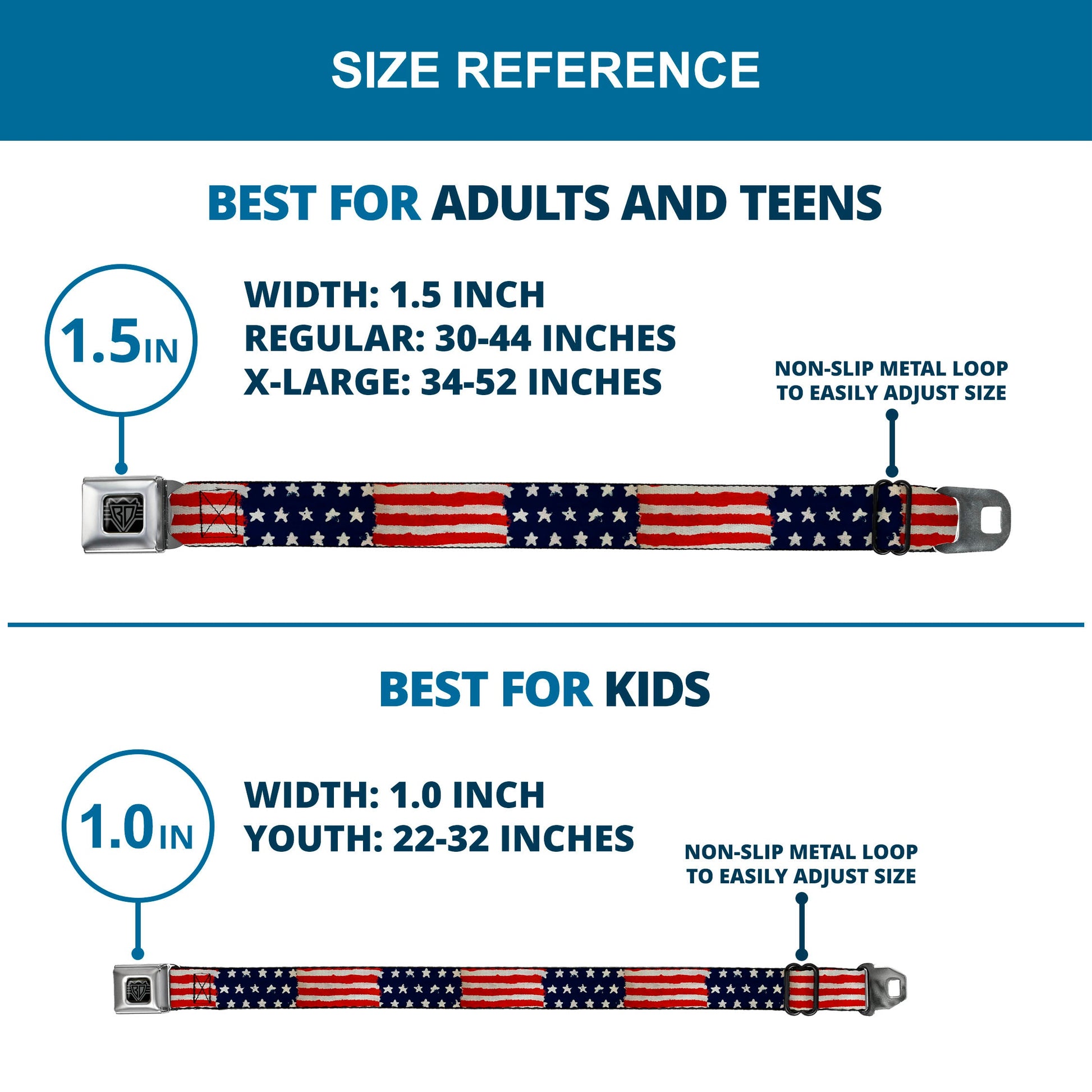 - Our adult-size Seatbelt Belts are 1.5 inches wide and our kid-sized Seatbelt Belts are 1.0 inch wide.