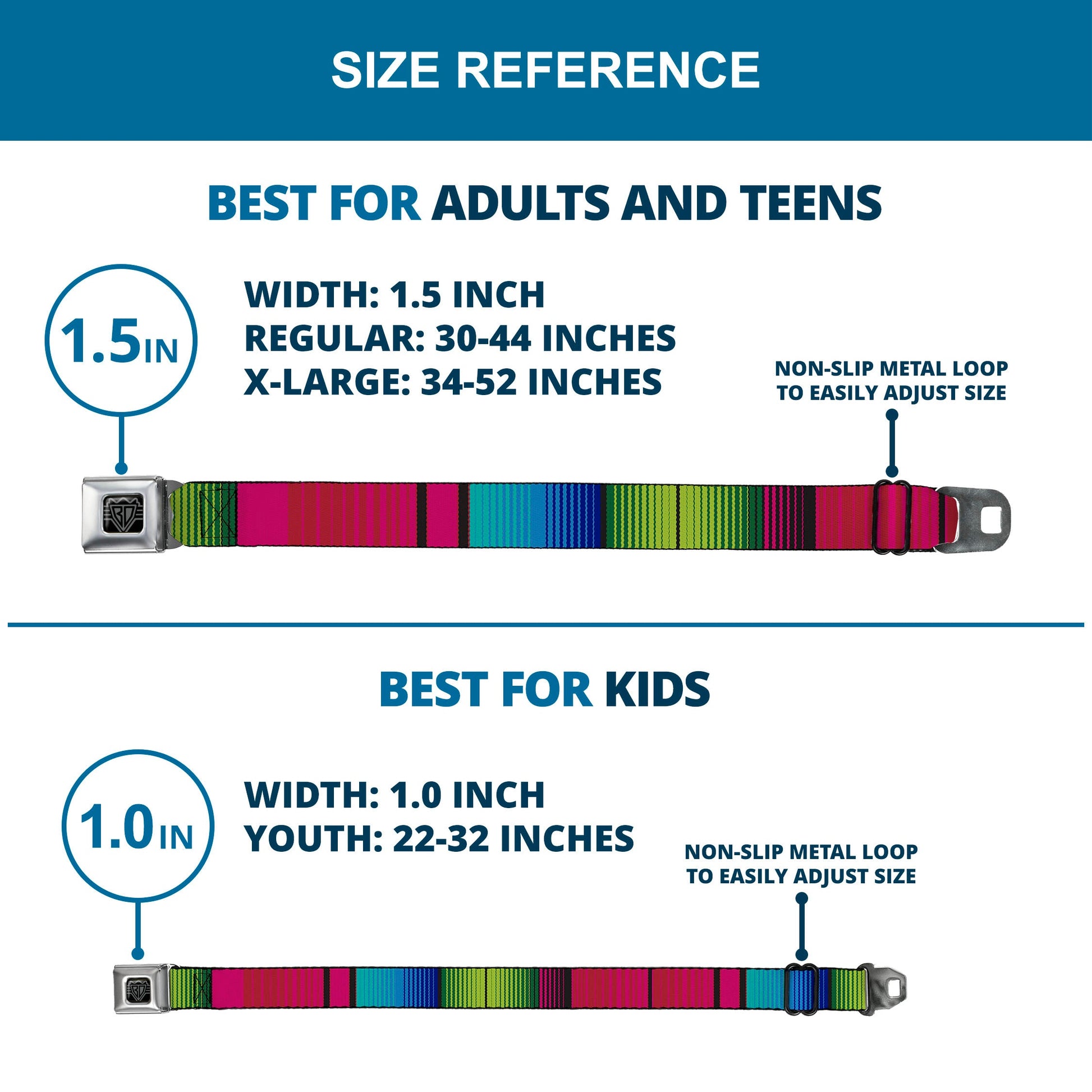 Buckle-Down's iconic Seatbelt Belt is a cool, smart, and exciting blend of fashion and function. Always a conversation starter, our Seatbelt Belt adjusts to perfectly fit your waist while showcasing your unique sense of style. Our Seatbelt Belts are made with authentic automotive style seatbelt buckles making them easy to open and close at the push of a button. Our adult-size Seatbelt Belts are 1.5 inches wide and our kid-sized Seatbelt belts are 1.0 inch wide. This product is Handcrafted in USA by Buckle-Down Inc. and officially licensed by Buckle-Down.