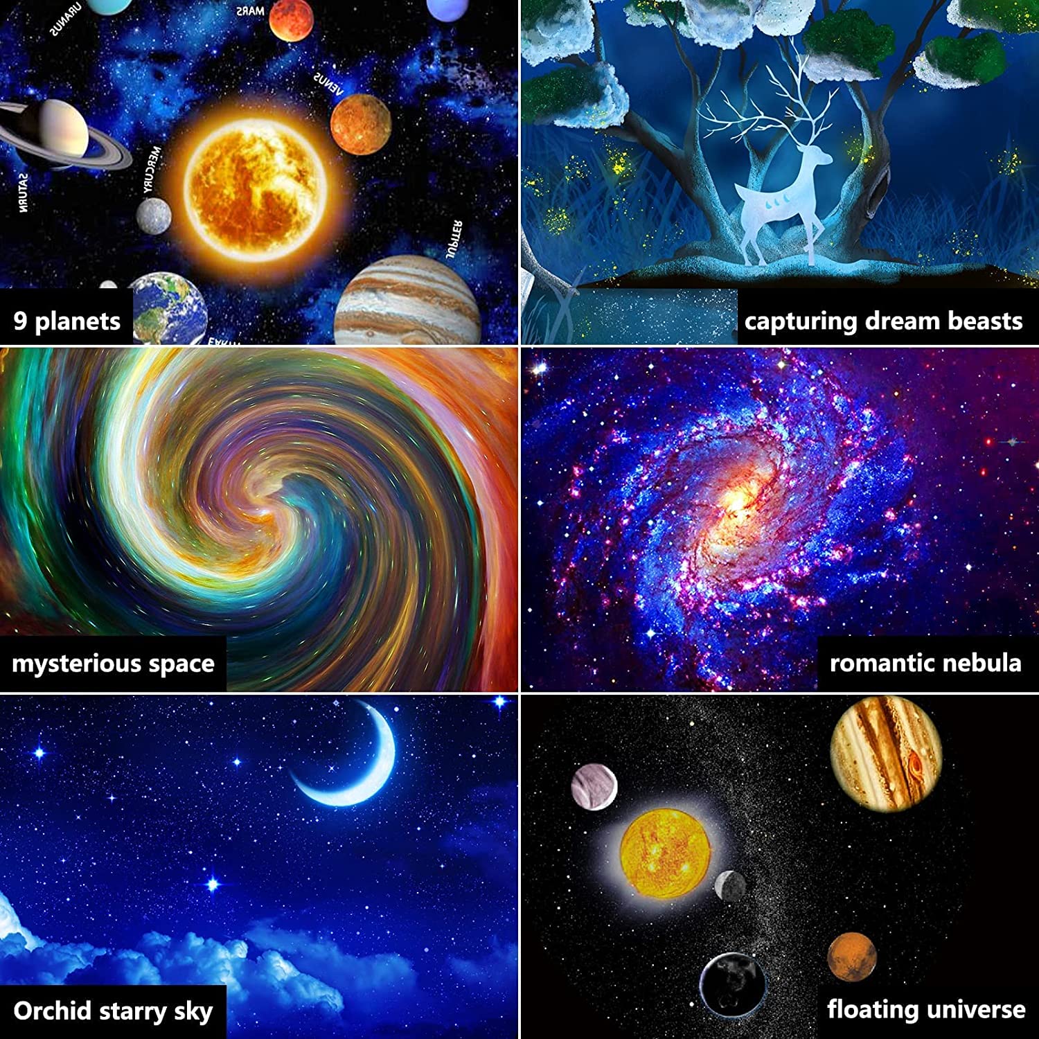 Introducing the Galaxy Projector Night Light! This amazing device projects a starry night sky onto your ceiling, walls, or any other surface. With six different display scenarios, you can choose to explore the moon, the stars, the planets, or even the Milky Way galaxy. The built-in blackbody vortex and solar system settings are perfect for educational purposes, stimulating children's imaginations and providing a fun and interactive learning experience. The projector comes with an optional movie light setting, allowing you to enjoy a relaxing evening under the stars without sacrificing your viewing experience. Whether you're looking for a unique decoration for your home or a fun and educational gift for a loved one, the Galaxy Projector Night Light is sure to impress. Order yours