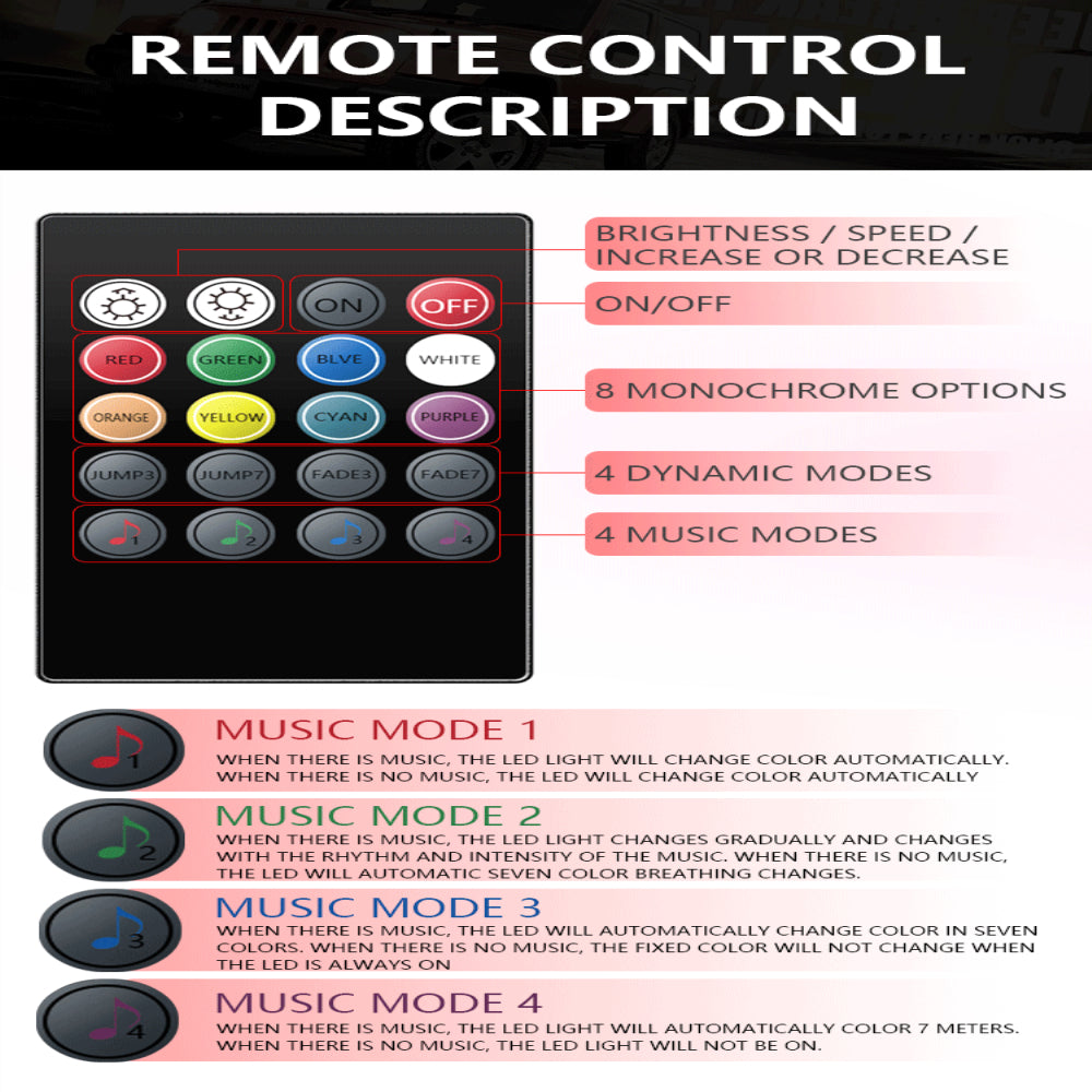 Do you want to add some personality and flair to your car? Then check out our LED Interior Car Neon Lights! These lights are perfect for adding a bit of fun and style to your ride. With 8 different colors and 4 music control modes, you can create a unique and exciting atmosphere in your car. The wireless remote control makes it easy to change the settings and create the perfect ambiance for any mood or occasion. So ditch those boring old car lights and give your ride a makeover with our LED Interior Car Neon Lights!