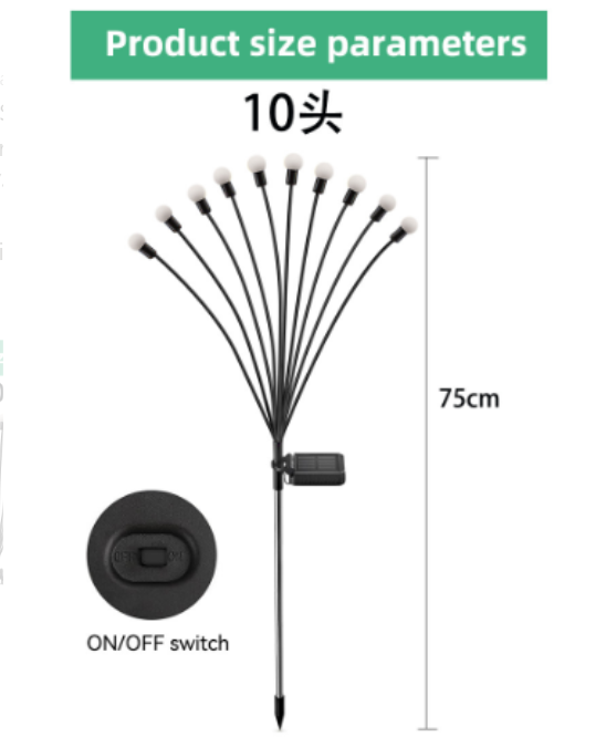 Specification:Name: Solar Firefly LightsMaterial: ABSSize: Overall height: 75cm (removable design)Bulb diameter: 17mm/ 0.67inchColor: Warm white/ colorfulStyle:6Head/10HeadCharging method: solar energyBattery: 1.2VAA600MA nimH batteryCharging time: 6-8 hoursWorking hours: 8-12 hours